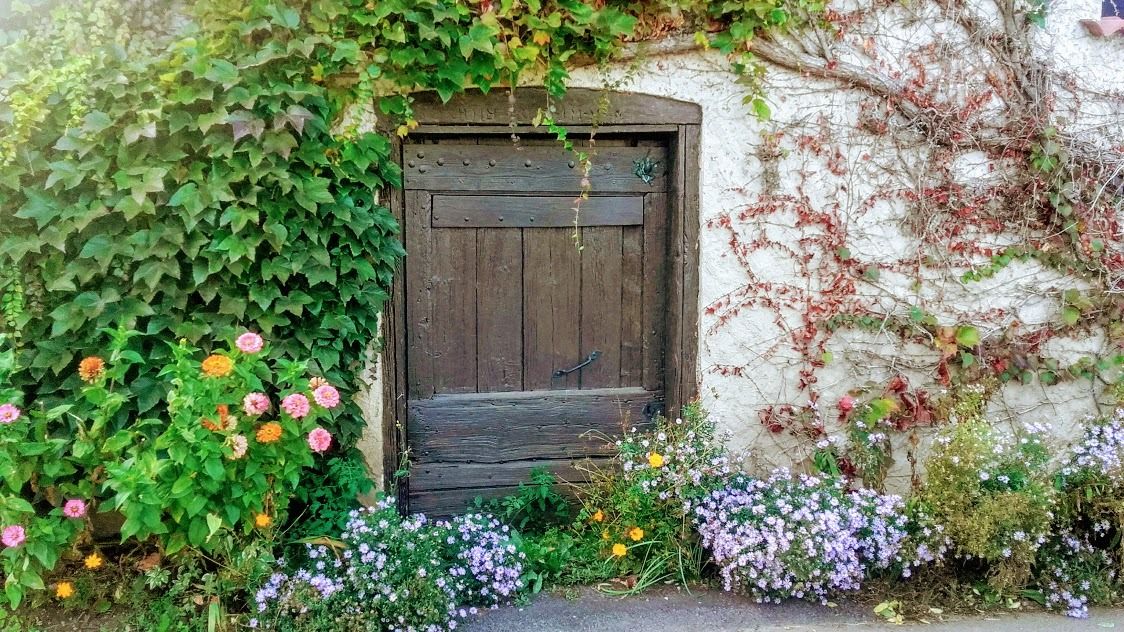 Une belle porte entourée de végétation automnale...